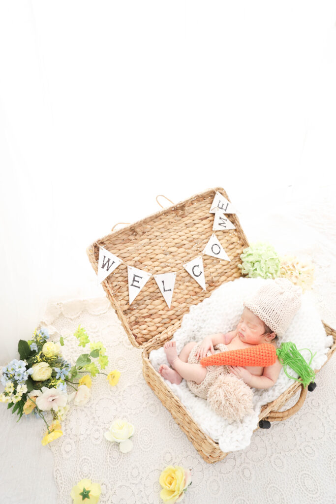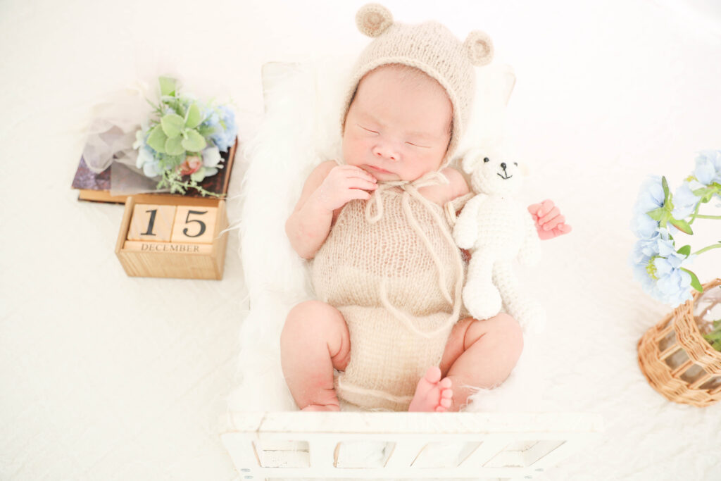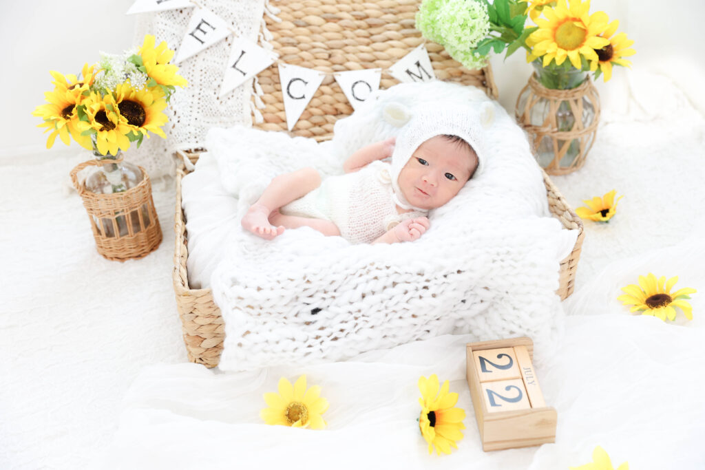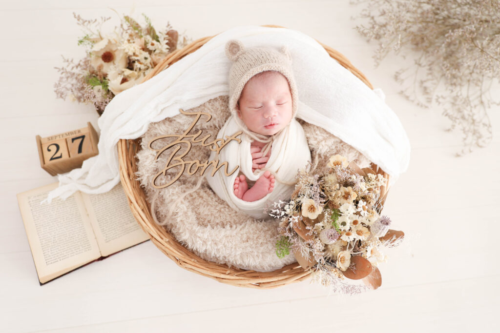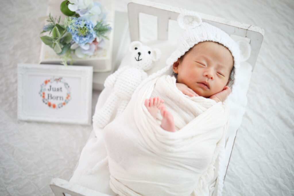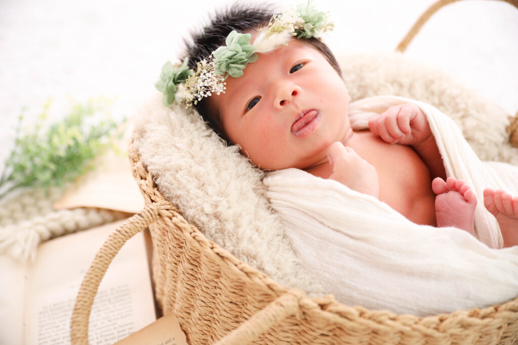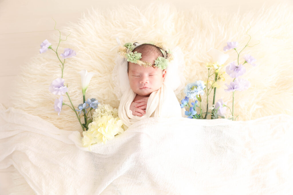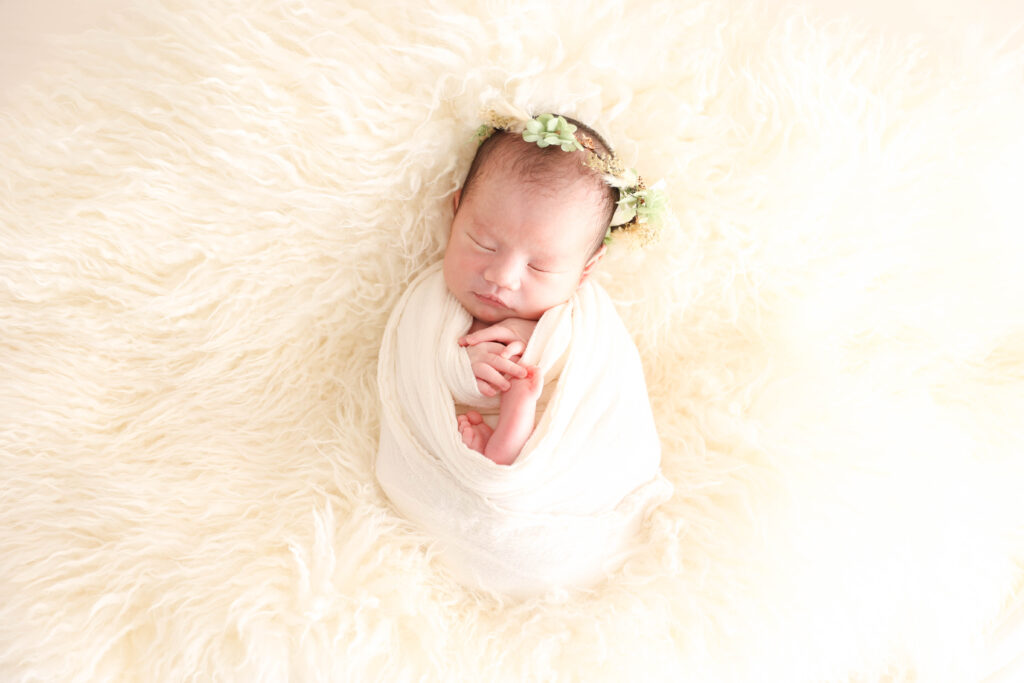 (生後2ヶ月頃まででしたら、ニューボーンフォトの雰囲気でスタイリングしておくるみで巻いて撮影可能です)